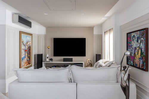 No home theater, o rack com painel que faz um ‘L’ no teto ganhou vida nova com a releitura proposta pela arquiteta Cristiane Schiavoni | Foto: Rafael Renzo
