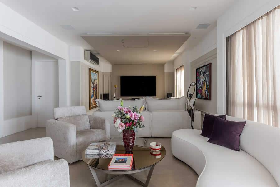 Com 230 m², toda concepção se pautou em aproveitar a excelente estrutura que já existia para realizar mudanças sutis e valorosas. A área social revela a integração dos ambientes em um décor que evidencia a proposta introduzida para cada um dos espaços. No home theater, um sofá superconfortável para as horas de ‘cinema em família’ complementa a magnífica estrutura de marcenaria que já existia: o rack e painel se unem como uma única peça e se estendem pelo teto. “Como encontramos um espaço bem formatado, fizemos questão manter o móvel, bem como o piso de limestone que reveste todos os ambientes”, recorda-se a arquiteta.