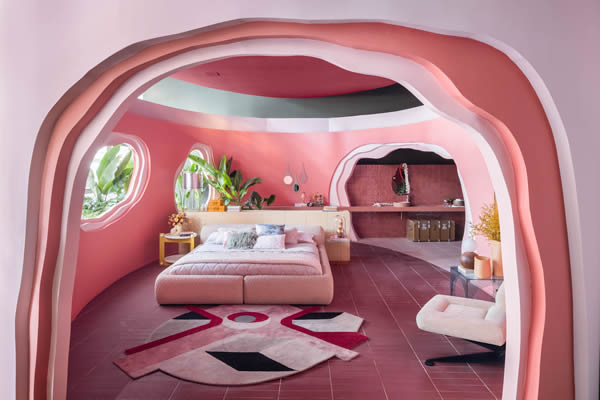 Ricardo Abreu | CASA CORAL: Pensado em uma mulher de 64 anos, as cinco camadas de paredes se somam para abraçar a casa, como uma metáfora às diversas camadas da vida da moradora. A casa de 225m² é dividida em duas grandes células. Uma social composta por sala e cozinha integradas e uma privativa, com o quarto, closet e banheiro. O espaço é predominantemente rosa, com uma arquitetura lúdica e futurista.