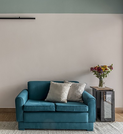Ao invés de preencher toda a parede com um sofá grande, a decisão por um modelo menor contribuiu com a ideia de oferecer uma área maior de circulação na sala de estar. O detalhe ficou por conta das duas cores na parede. | Foto: Rafael Renzo