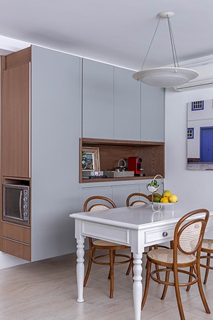 “Aprecio móveis versáteis, pois nos ajudam na tarefa de otimizar os espaços”, ressalta Carina. Ela também sugere o uso de mesas e banquetas com baú, forno com micro-ondas e torneira com filtro embutido, que são excelentes para ambientes pequenos.