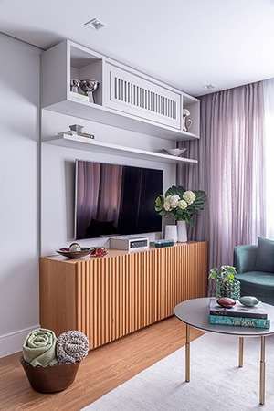 Nesta sala de estar projetada pela arquiteta Carina Dal Fabbro, o rack da TV também faz às vezes de buffet para guardar os itens dos moradores. Na parte superior, o nicho com um armário ripado camufla o ar-condicionado, além de contribuir com o décor | Rafael Renzo