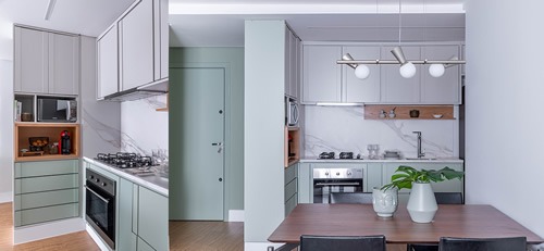A combinação de projeto e planejamento de qualidade é o segredo para uma cozinha que satisfaça às necessidades do morador. Isso é o que a arquiteta Carina Dal Fabbro propôs neste projeto: um visual que complementa o ambiente. Carina apostou na cor verde menta e cinza fendi e detalhes nos armários da cozinha em MDF madeirado. Na composição do móvel superior, os armários receberam laca fosca cinza-claro, em um resultado que trouxe leveza e modernidade | Fotos: Rafael Renzo