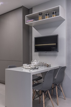 Na disposição da planta baixa não há como incluir uma mesa mais padronizada para as refeições? Nesse projeto realizado pela arquiteta Carina Dal Fabbro, o pouco espaço foi resolvido com uma marcenaria em ‘L’, com acabamento em laca, fixada na parede. Para acompanhar, quatro cadeiras Eames são perfeitas para acomodar os moradores e possíveis convidados | Foto Rafael Renzo