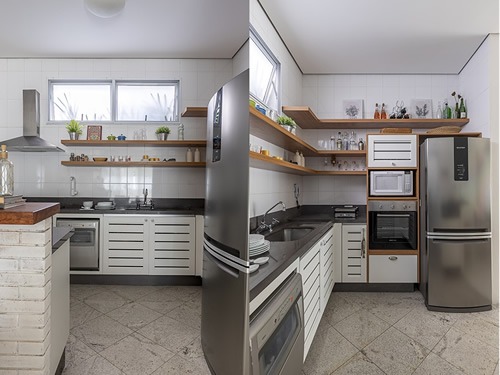 Cozinhas de tipo corredor são costumeiras em apartamentos pequenos e os armários podem ser os vilões, caso sejam colocados em excesso. “Uma parede estreita pode comportar prateleiras ou um armário com nichos e gavetas, sendo uma ótima opção de projeto. Além disso, recomendo não adotar eletrodomésticos grandes para que os espaços sejam preenchidos de forma coerente”, avalia Carina.