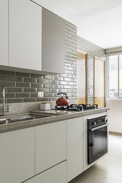Para a escolha da bancada dessa cozinha, a arquiteta Patricia Miranda investiu na aplicação de materiais duráveis e resistentes, caso do Neolith. No espaço do frontão, ao invés de um revestimento tradicional, ela optou por seguir com o mesmo material por mais 55 cm de altura, alinhando com o armário superior do projeto | Foto: Caca Bratke