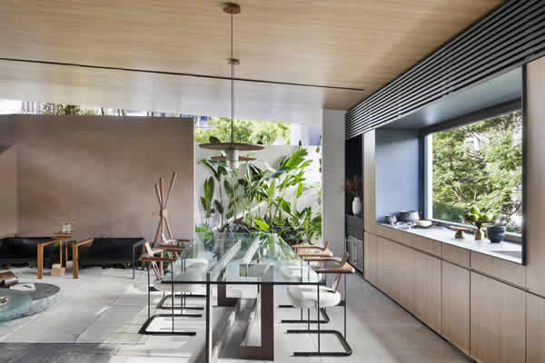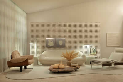 Na Casa LG, a BC Arquitetos traz em 300m2, a ancestralidade presente em referências de moradias primitivas. Cores e texturas se misturam a soluções hightechs e a mobiliários Celmar, que colaboram para dar o tom estético, artístico e funcional aos espaços. Destaque para marcenaria executada na ampla estrutura quadriculada que adorna a parede em ponto central do projeto. Os nichos, na tonalidade matizada de marrom terroso, e se estendem ao teto e recebem leve iluminação.