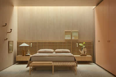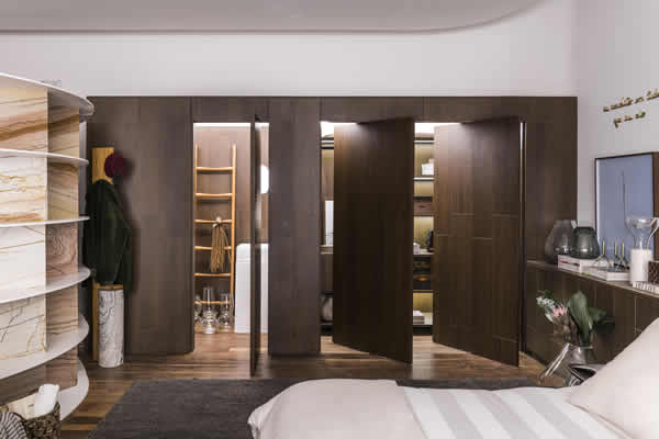 O aconchego das madeiras clara Nogueira Thar e a escura Nogueira Vêneto, junto com a Laca Rosa Queimado, trazem um destaque para o pórtico que engloba o quarto, banheiro e a cozinha. No quarto, o armário embutido é apresentado em uma releitura do mobiliário lançado pela Celmar, nos anos 1950. A peça que marcou o segmento pela inovação, chega revisitada pelo olhar das profissionais em cores, tecnologias e acabamentos exclusivos para esta edição da mostra. Na cozinha, a sensação de bem-estar é ampliada pela funcionalidade e estética apurada dos armários Celmar, com sistema de abertura eletrônico sensível ao toque.