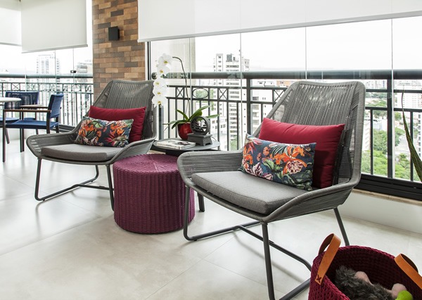 As almofadas são como uma carta coringa na decoração. Neste projeto assinado pela arquiteta Gigi Gorenstein, elas destacaram as poltronas da varanda e funcionaram muito bem como uma referência de cor na área | Foto: Eduardo Pozella