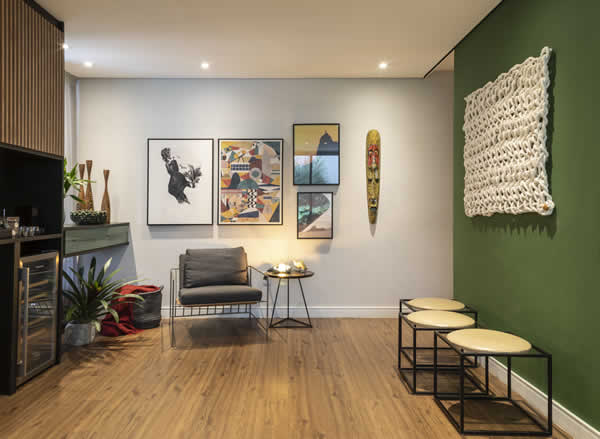 O cantinho do home bar e café recebeu um toque sofisticado com a gallery wall contemporânea idealizada pela arquiteta Gigi Gorenstein | Foto: Evelyn Müller