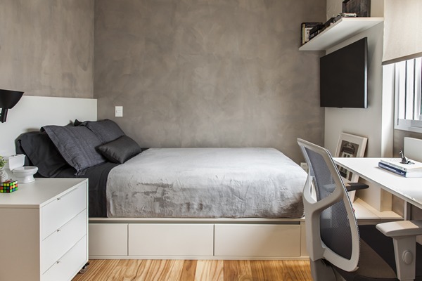 No décor de interiores, o efeito de cimento queimado virou tendência e marcou presença nesse dormitório com um ar contemporâneo, de estilo industrial | Projeto Gigi Gorenstein Arquitetura | Foto: Eduardo Pozella