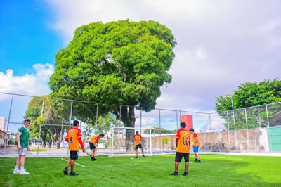 A grama sintética presente no campo proporciona uma superfície uniforme e consistente para a prática do futebol society, permitindo que os jogadores tenham um controle melhor da bola | Projeto do escritório Effect Arquitetura com a Prefeitura de Macapá | Foto: Jesiel Braga