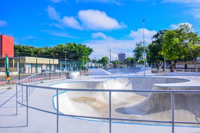 Imagem da estrutura bowl, uma área em formato de bacia ou piscina com paredes curvas, onde os skatistas podem realizar manobras em alta | Projeto do escritório Effect Arquitetura com a Prefeitura de Macapá | Foto: Jesiel Braga