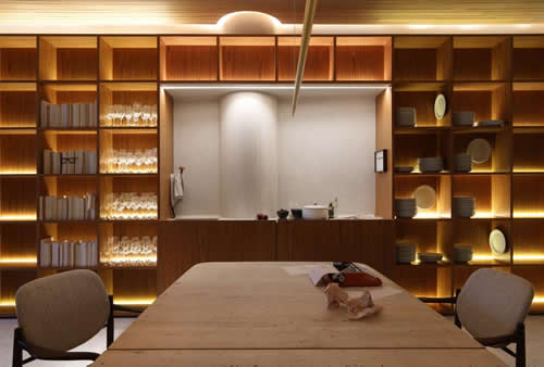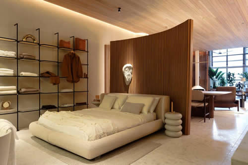 E para trazer uma atmosfera acolhedora e repleta de personalidade, escolheu uma marcenaria planejada, feita em uma parceria exclusiva com a Criare, que tem como destaque uma grande estante em lâmina de madeira Freijó, desenhada por ela especialmente para o ambiente e que percorre a parede principal. Neste espaço, o visitante contempla objetos simbólicos e afetivos, mas também espaços vazios que remetem ao que ainda será vivido, simbolizando a construção das memórias.