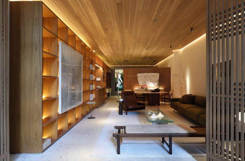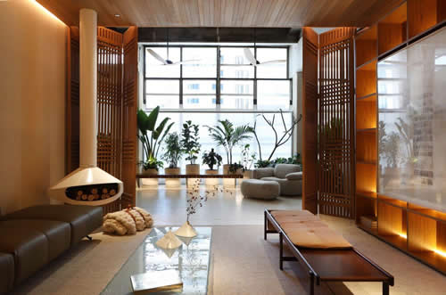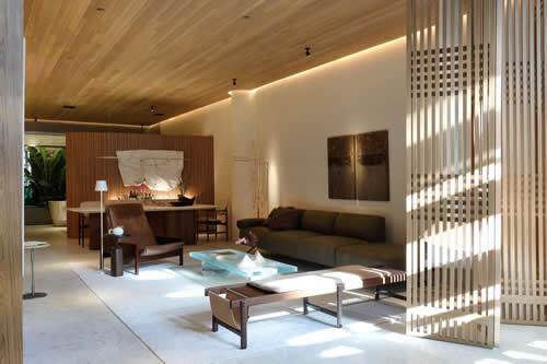 Outro destaque é a porta em muxarabi, que deixa entrar a claridade natural das vidraças do Conjunto Nacional e traz uma luz poética ao ambiente, tornando-o ainda mais convidativo. Ao fundo, uma tela tensionada simula uma claraboia para trazer luz ao paisagismo, como uma janela em um jardim para os momentos de contemplação. “Tudo foi pensado para criar a melhor experiência, em alusão à felicidade que deve ser vista além de um simples recorte, mas vivida com intensidade. E esse sentimento de contentamento só pode ser encontrado em um lugar de leveza, livre de julgamentos e cheio de afetividade”, comenta Barbara.