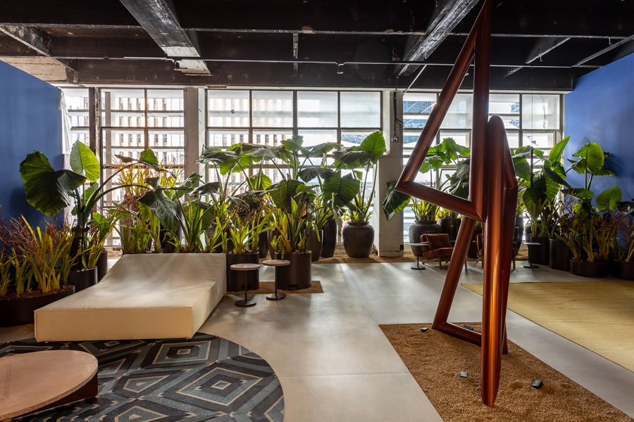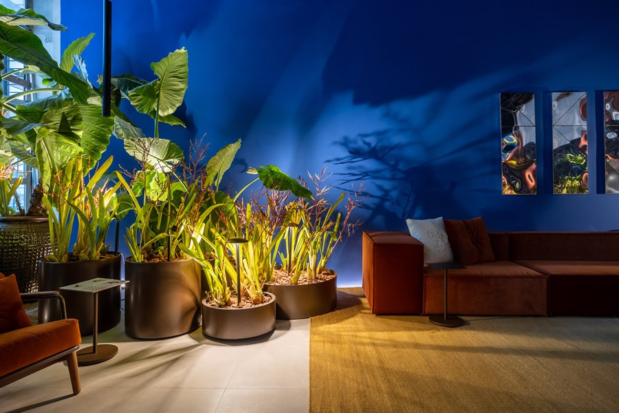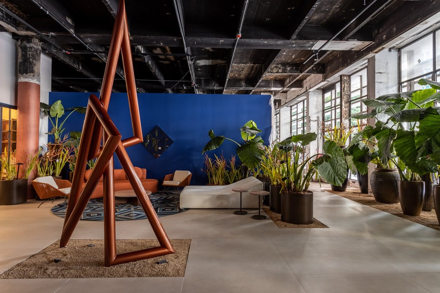 Obras de arte, móveis com suaves curvas e uma composição de plantas ornamentais se complementam em um projeto encantador e transformam o jardim em um grande living natural, emoldurado pela iluminação abundante das janelas do Conjunto Nacional | Foto: JP Image