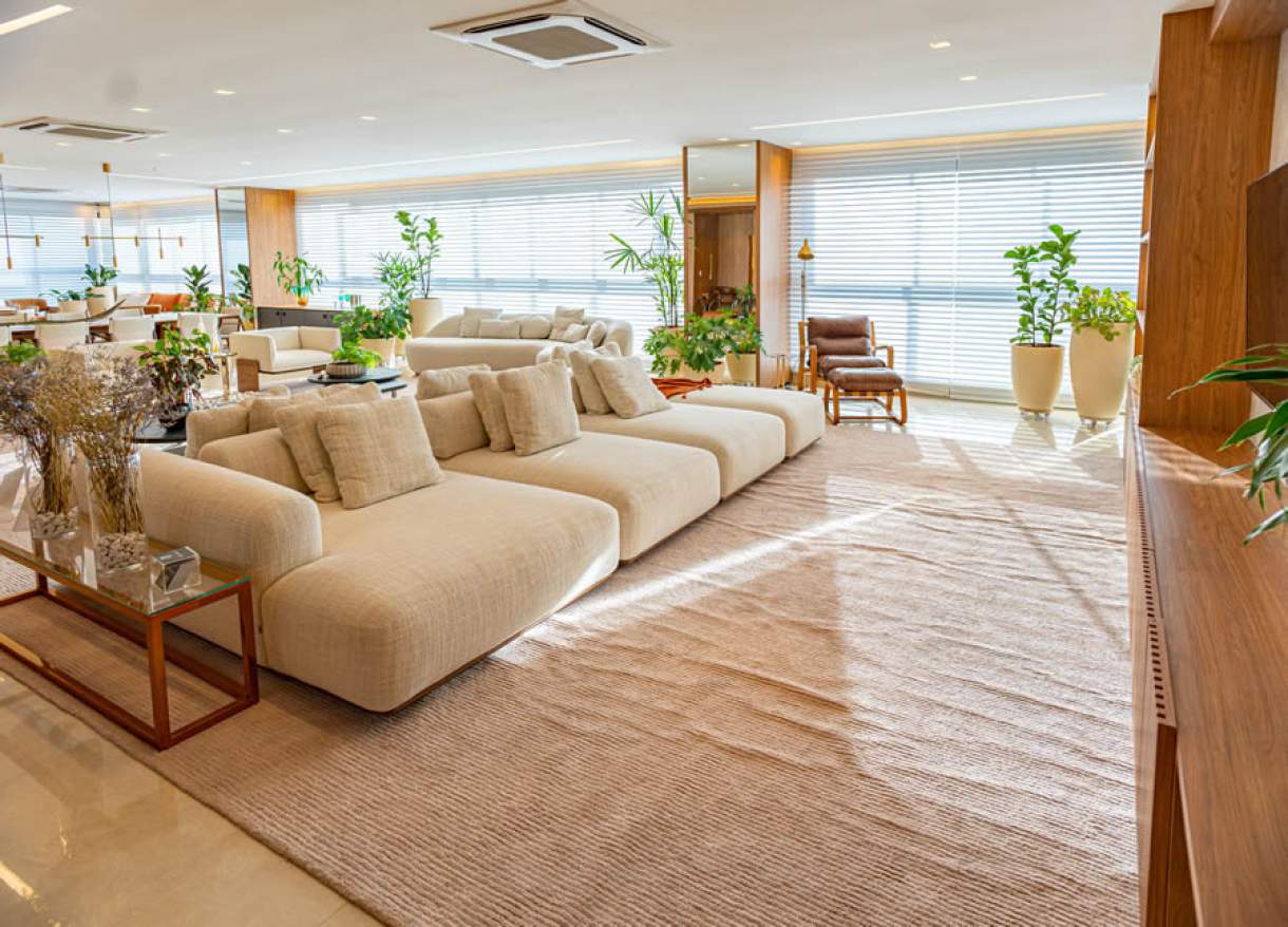 No atual apartamento pronto e decorado por ela, Elisa pensou em uma proposta abrangente, atemporal, leve e elegante. “Foi aplicada uma paleta de cores neutras, com cores pontuais no paisagismo. Usamos forros amadeirados para fazer um elo entre os ambientes e trazer a sensação de aconchego e acolhimento. Já nos objetos decorativos e no sofá gourmet, usei o terracota. Também elegi alguns metais dourados que trazem leveza e sofisticação”, define.