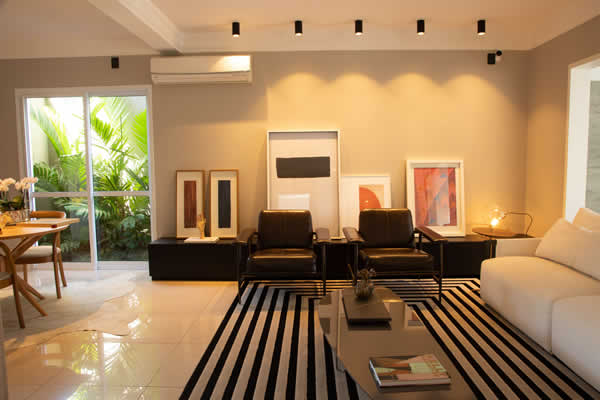 Na sala de estar assinada pela arquitetura Caru Cunha, os spots produzem um jogo de sombras que valorizam as obras de arte dispostas no móvel | Foto: Arthur Matos