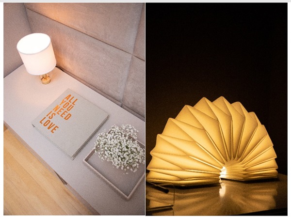 Desde os modelos clássicos aos mais modernos: os abajures favorecem o ambiente! Elementos decorativos por si só, tornam-se visualmente atraentes e complementares, como é possível ver na imagem à esquerda. A frase dourada na capa do livro brilha aos olhos sob a luz próxima | Foto: Arthur Matos