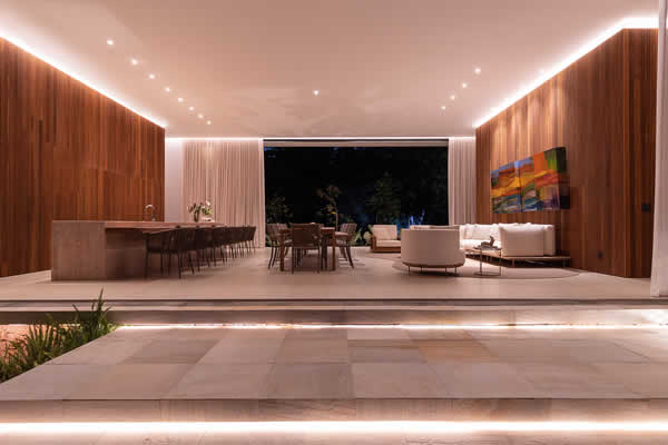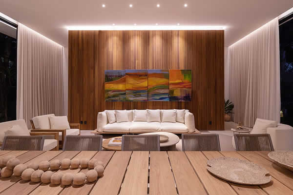 Em mais um projeto assinado pela arquiteta Caru Cunha, no living integrado com a sala de jantar, novamente as fitas de LED e spots embutidos nos forros transformaram os ambientes voltados à convivência e bem-estar entre os moradores e seus convidados. Com o efeito ripado da marcenaria que reveste toda a parede, as luzes ressaltam a obra de arte que adorna as costas do sofá | Foto: Marina Scalon