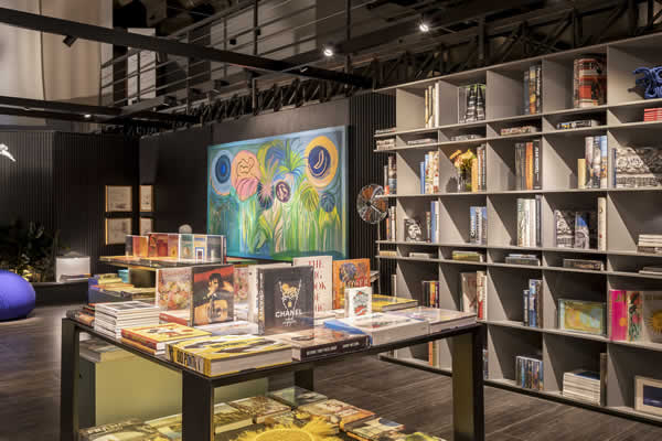 Estantes valorizadas pela iluminação de trilhos e spots com fachos focados e fechados compõem o circuito fluido da Livraria com Arte, projeto de estreia de Sílvia Camargo, Caru Cunha, e Nana Cunha na CASACOR São Paulo 2023 | Foto: Rafael Renzo