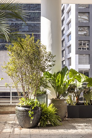 Ao brincarem com as formas e a disposição das espécies, cultivadas em vasos vietnamitas, o resultado ressoa muito distante de um jardim óbvio. Sem a intervenção de obras – uma vez que o Conjunto Nacional é tombado como patrimônio histórico –, o layout do Mirante Paulista acompanha a sinuosidade do edifício. Portanto, as espécies mais altas, como as palmeiras traquicarpos, possibilitaram recobrir e colocar em segundo plano paredões e esquadrias brancas | Foto: Evelyn Müller