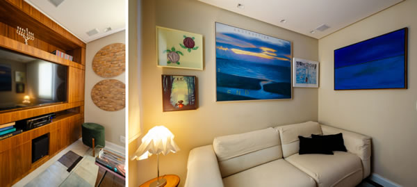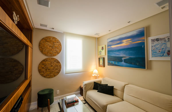A sala de televisão é outro destaque e a arte se faz protagonista novamente, sendo responsável por emprestar cor e expressão ao espaço. As paredes foram pintadas na mesma cor do living, assim como o piso mantém a unidade nas áreas sociais. O painel da televisão preenche toda a parede e, assim como a mesa de centro, também presente na sala, foi desenhado pela dupla de profissionais para ser imponente e elegante. “Nossas principais estratégias foram pautadas na concepção e espaços modulados que propiciam a sensação de organização que tanto gostamos. Agora é possível guardar a maior parte dos objetos e aproveitar uma sessão de cinema de forma aconchegante”, lembra Eloy.