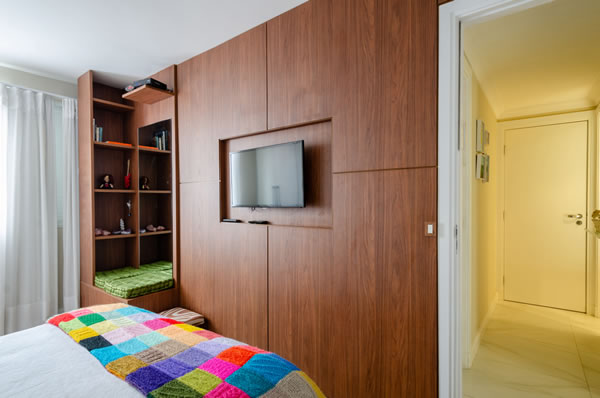 Para o quarto da moradora, o pedido foi simples: um espaço para usar como seu. Por isso, o grande painel de cumaru foi o responsável pela renovação visual e superfícies projetadas especialmente para acomodar itens, objetos pessoais e vestimentas da moradora, em substituição ao antigo armário.