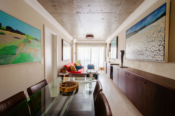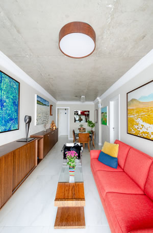 Ao entrar na residência, o living ladeado de quadros artísticos já chama a atenção das visitas e se torna o cartão postal do apartamento. A atmosfera contemporânea foi combinada com o uso de madeira bem trabalhada e revestimentos claros, como o piso de porcelanato e a cor das paredes, produzida especialmente para as paredes do projeto. “Além disso, a ideia de deixar a laje original foi uma decisão com o intuito de contrastar com o piso, quebrando um pouco do branco no espaço, e assim conseguimos dar destaque às obras de arte, resultando em um living com efeito mais rústico e natural”, explica Felipe.