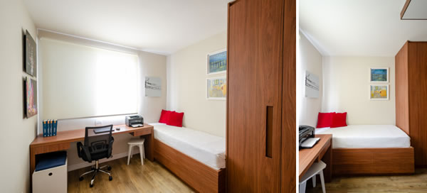 O dormitório não foi impactado por grandes alterações, apenas com o acréscimo de modulados para auxiliar o dia a dia da moradora | Projeto do escritório Trees Arquitetura | Foto: Ricardo Abreu