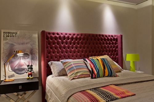 Com a predominância do branco, a cabeceira da cama foi estofada com o tecido Londa, da Dino Zoli Brasil. A suavidade contrasta com o colorido da parede, dando um toque de proteção ao dormitório | Foto: Thais Oliveira