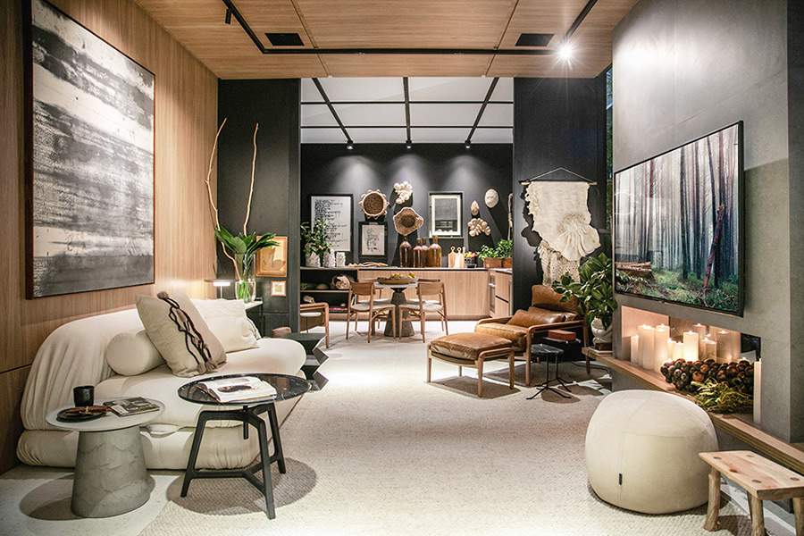 A coleção de tecidos Pecora, também lançamento, é uma interpretação da Dino Zoli para uma pele de ovelha. A textura é uma característica que, além de proporcionar proteção, contribui com o atributo da elegância ao projeto. A paleta de cores neutras é uma opção para o uso em composições mais contemporâneas | Fotos: Tati Ogava