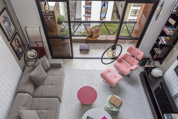 Nesse icônico loft realizado pelo escritório Korman Arquitetos, das arquitetas Ieda e Carina Korman, o rosa foi eleito como o destaque dos espaços e, para compor com a paleta, o cinza permitiu um importante senso de equilíbrio. A clássica poltrona Charles Eames, com apoio nos pés, ganhou nova roupagem com o tecido na cor favorita da moradora e as mesinhas de centro, desenhadas por elas, para entregam o aconchego das formas orgânicas.