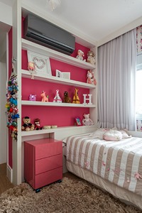 Neste projeto infantil executado pelas arquitetas Paula Passos e Danielle Dantas, à frente do escritório Dantas & Passos Arquitetura, a escolha evidenciou tom de rosa na decoração que deixou o dormitório super alegre e vibrante, com destaque para um trabalho muito bem pensado de marcenaria para acomodar boa parte dos brinquedos da criança. A graça da cor combina ao branco para trazer unidade ao espaço da pequena moradora.