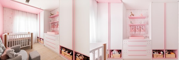 Através de um trabalho minucioso com marcenaria em tom rosa, o projeto da arquiteta Daniela Funari contou com papel de parede, nichos próximos ao chão para armazenamento dos brinquedos e muita ternura! Para o quarto da filha recém-nascida de um casal, foi proposto um céu estrelado para a iluminação do teto, conquistado por meio de pontos de luz que simulam o brilho das estrelas através da marcenaria. Nesse contexto, a marcenaria ao redor do berço contribuiu para que a sensação de conforto fosse completa, abraçando o ambiente e criando um ninho. A poltrona de amamentação cinza completa o décor do ambiente, deixando as cores bem trabalhadas no espaço.