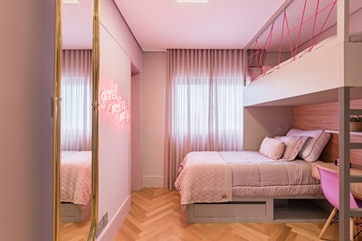 Muito charme e estilo nesse dormitório produzido pela arquiteta Ana Rozenblit, do Spaço Interior, com várias referências ao universo Barbie! O neon ilumina o cômodo e espelho giratório é outro trunfo que renova a maneira como o item é geralmente integrado na decoração. A proteção da cama superior, em rosa choque, completa a paleta de cores e uma charmosa escrivaninha, acoplada ao beliche através da marcenaria planejada. É acompanhada, como a cadeira devidamente selecionada com a cor.
