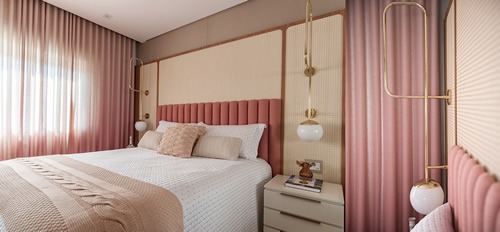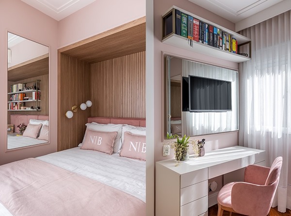 Neste dormitório assinado pela arquiteta Cristiane Schiavoni, um grande pórtico abraça a cama e deixa a área de descanso ainda mais acolhedora. Uma penteadeira facilita os momentos de lazer e beleza em conjunto com a televisão para os filmes no fim do dia. O rosa da cabeceira, paredes, enxoval e a poltrona expressa a personalidade do projeto e o segredo se pautou justamente no equilíbrio com as cores neutras e o amadeirado que adorna o espaço de dormir.