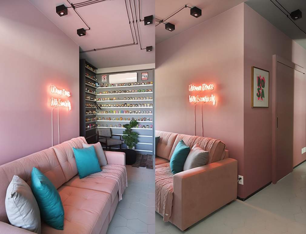 O proprietário deste apartamento é um jornalista apaixonado por cores e por música, além da sua coleção particular com mais de 350 funkos. Na sala de estar, concebida pela arquiteta Pati Cillo, um degrade de rosa (tinta Sherwin-Williams) serviu de base para o neon com a música da Whitney Houston, I Wanna Dance With Somebody, a preferida do morador. O sofá também recebeu um tecido rosa (Donatelli) para completar a monocromia cor de rosa que traduziu a alegria sonhada para o novo apartamento, no centro de São Paulo.