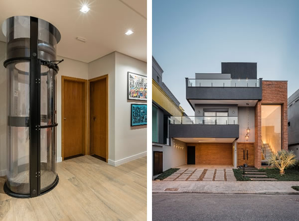 Nas imagens é possível ver o elevador residencial instalado e a casa ampla, de dois andares, que recebeu o equipamento | Projeto de PB Arquitetura e foto de Henrique Ribeiro