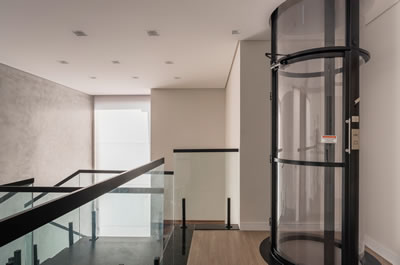 Garantia de comodidade e agilidade na locomoção interna, os elevadores residenciais são procurados principalmente em imóveis de vários andares, residências com a presença de idosos, pessoas com dificuldades de locomoção ou dores crônicas | Projeto de PB Arquitetura e foto de Henrique Ribeiro