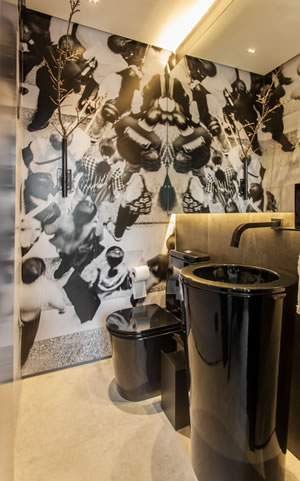 Nesse projeto de lavabo, o papel de parede retrata o cotidiano e a correria de viver em grandes cidades – uma compreensão capturada pela fotografia que capturou a beleza e se transformou no principal atrativo do ambiente.