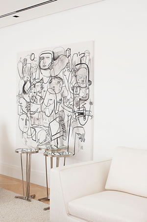Para adornar o living, os traços do artista plástico Loro Verz parecem fazer parte da tela em branco e traz destaque ao espaço de leitura.