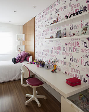 O papel de parede faz uso de frases e palavras para compor a decoração, deixando a área agradável para o estudo.