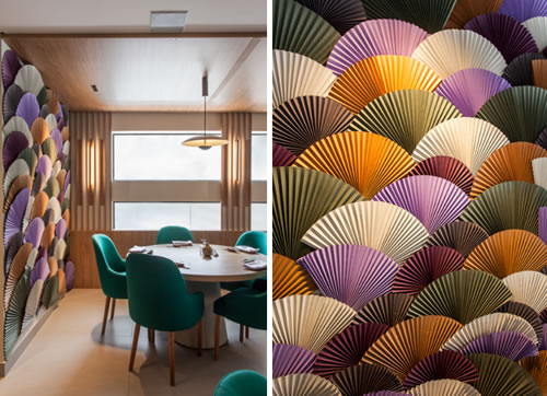 Fazendo referência às tradições japonesas, como o origami e o leque, a artista Adriana Suzuki foi convidada pelo escritório para elaborar um mural incrível com a combinação das dobraduras. Repleto de cores que dão vida ao ambiente, resultam em um ambiente ainda mais prazeroso de se estar.