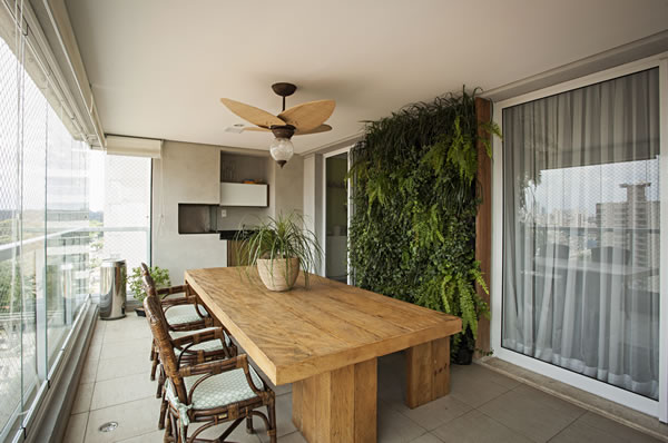 O jardim vertical é capaz de transformar os ambientes e conferir frescor e descontração. Esse projeto realizado pelo escritório, com influência urban jungle, combina com outros elementos no desejo de enfatizar o estilo rústico.