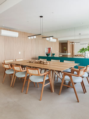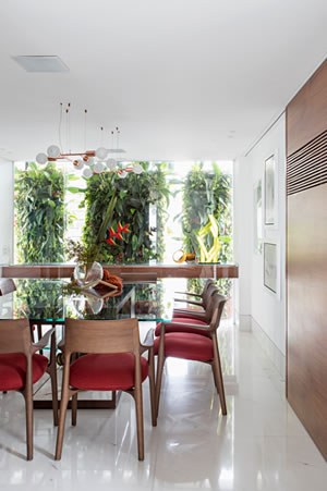 A parede verde também funciona muito bem e expressa sua beleza em ambientes internos, como nesse projeto, onde trouxe uma ode ao natural na sala de jantar. Junto com o prazer em apreciar, outros benefícios desse tipo de jardim é a melhora significativa na qualidade do ar.