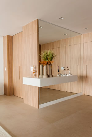 Ao utilizar espelhos como revestimento integral das paredes, a superfície reflexiva do elemento confere uma estética moderna e luxuosa, complementando diferentes estilos de decoração.