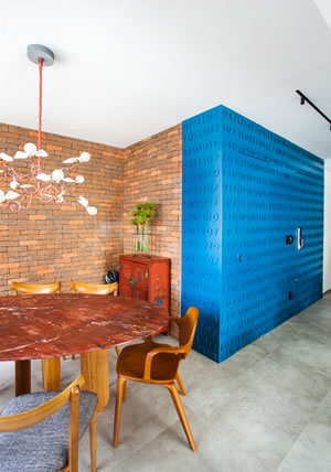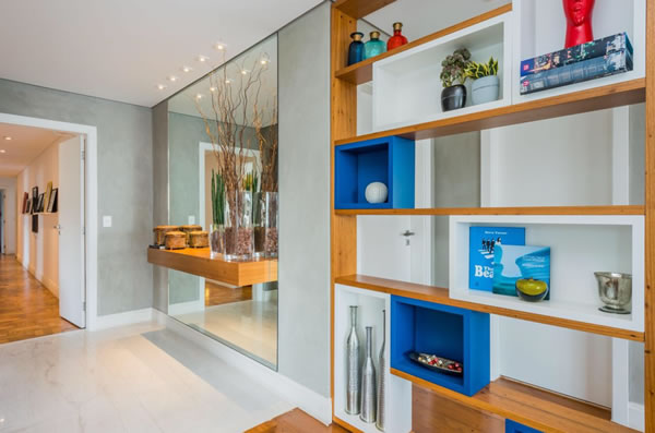 A entrada do loft realça a paixão dos moradores pelas artes e consegue ser ponto de destaque por toda área social. A parede, revestida de MDF laqueado azul, mimetiza as portas da entrada e entrega toda a graça ao espaço.