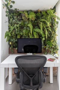 A combinação de espécies também combina com o home office e faz toda a diferença no bem-estar diário. Aqui, no projeto realizado por Ieda e Carina, as espécies precisam de pouca manutenção, como a samambaia.