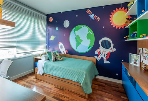 Toda criança que sonha em ser astronauta pode se maravilhar com esse quarto. Um grande adesivo de parede retrata essa paixão pelo e espaço de forma lúdica e pueril.